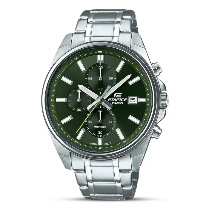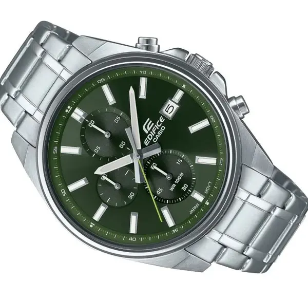 The Casio EFV-610D-3CVUDF is a sleek and sophisticated analog watch that combines precision, style, and durability. Designed for modern men who appreciate classic style with a touch of contemporary flair, this watch features a vibrant green dial accented by silver-tone markers and a stainless steel band for a polished look. The mineral glass protects the dial, ensuring lasting clarity and scratch resistance.