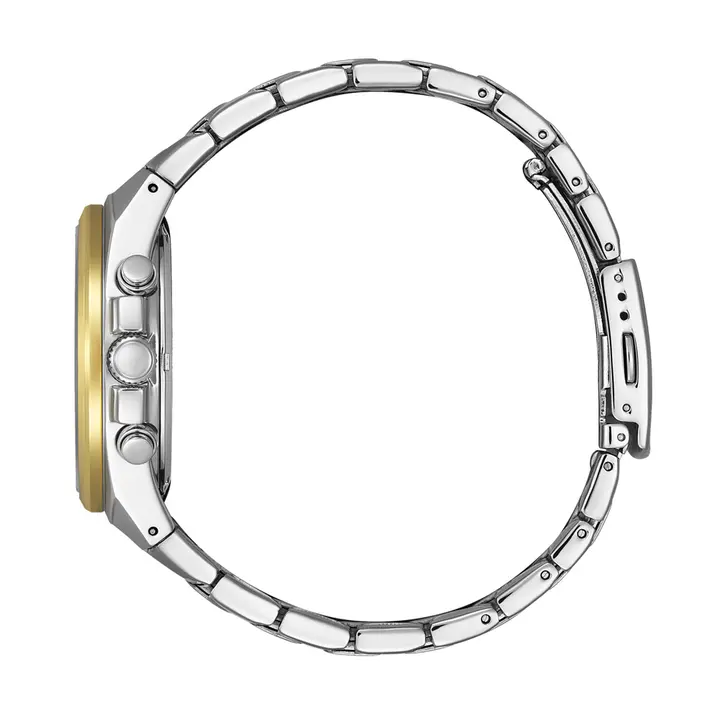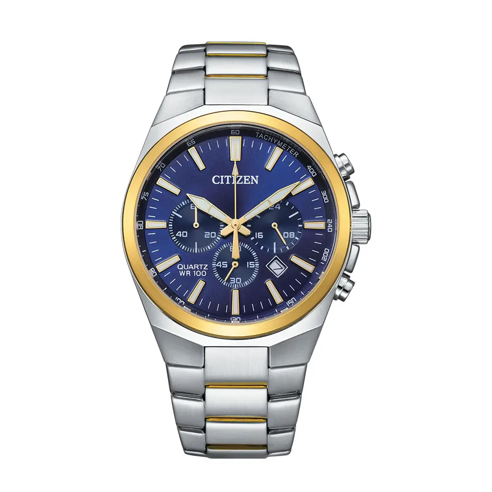 Elevate your wristwear with the Citizen AN8176-52L Men's Chronograph Watch, a harmonious blend of functionality and luxury. Crafted with a two-tone stainless steel case and bracelet, this timepiece exudes sophistication and versatility, seamlessly complementing both casual and formal attire. The striking blue dial, adorned with gold-tone hands and index hour markers, ensures clear readability and adds a touch of elegance to your ensemble.
