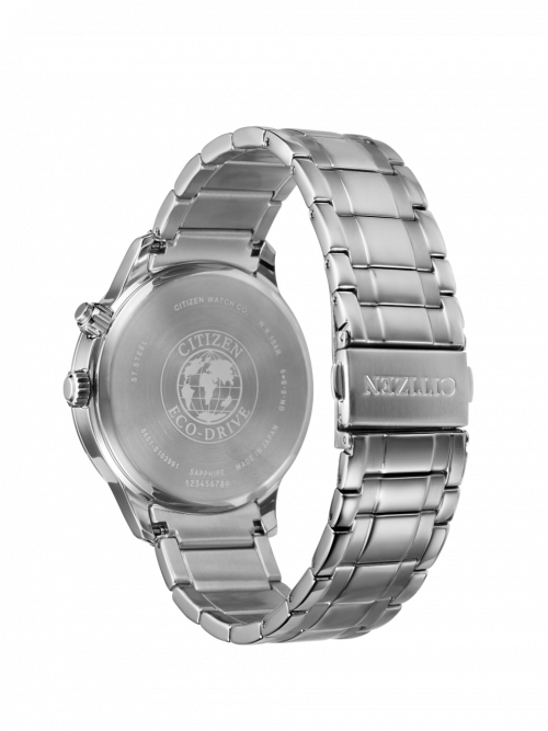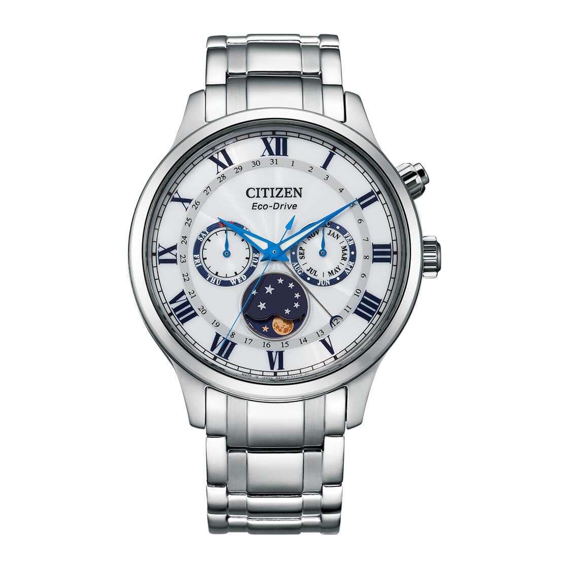 Powered by Citizen's proprietary Eco-Drive technology, the AP1050-81A harnesses both natural and artificial light to power the watch, eliminating the need for battery replacements and promoting environmental sustainability. The moon phase indicator at the 6 o'clock position adds a unique touch, while the day and date display at the 3 o'clock position enhances its practical design.