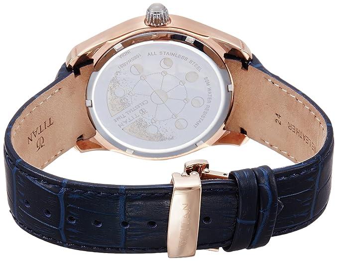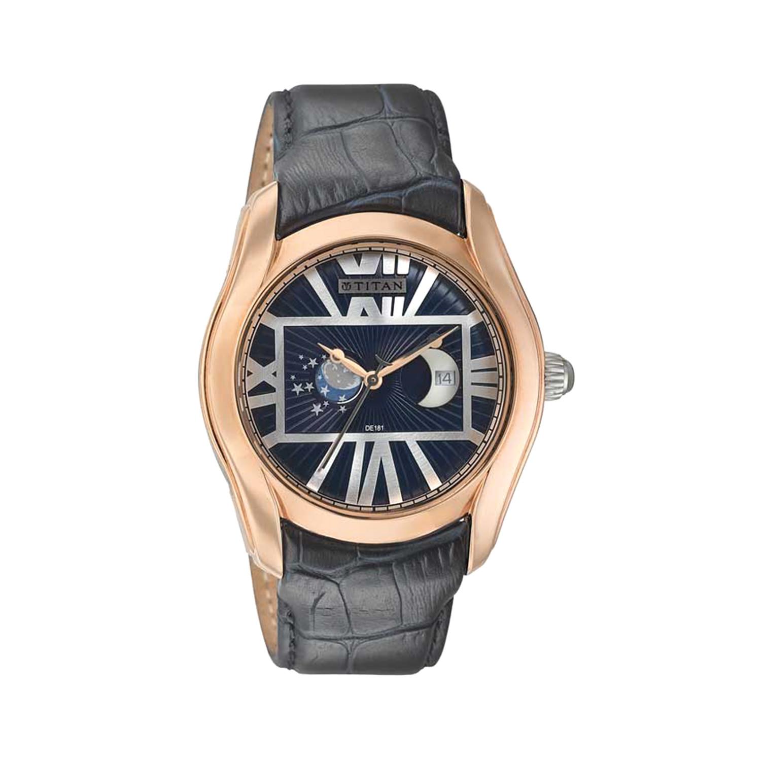 The Titan Celestial Time Moonphase Analog Watch (Model: 1665WL01) is a distinguished timepiece that seamlessly combines functionality with classic design. Its blue dial features a moonphase complication, allowing you to track the lunar phases with precision.