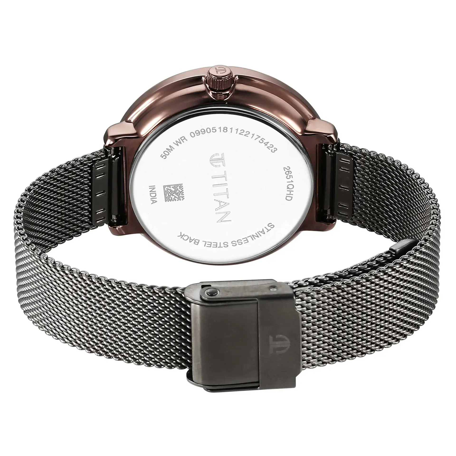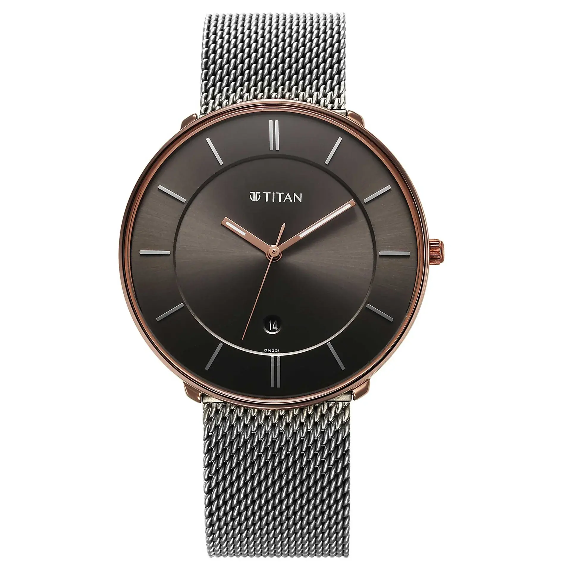 This Titan Noir model features a stylish gunmetal-tone stainless steel mesh or link bracelet, secured by a sliding clasp for seamless comfort.