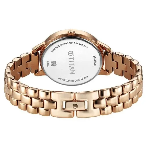 The Titan Neo 2648WM10 delivers tailored elegance with its striking grey metallic dial paired against a rose‑gold polished strap.