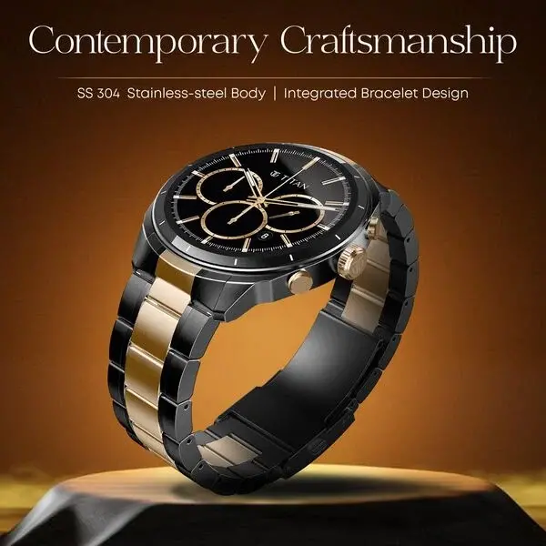 Feel empowered with elite smart features: heart rate and SpO₂ tracking, stress and breath coaching, Titan Health records, and over 100 sports modes. Whether trekking, working out, or walking the city, the IP68-rated stainless steel body and bracelet balance function with polished style.